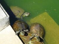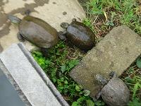 9月23日(水)涼しい中で一日がスタートしました。朝一番で中庭を越えて音楽室より歌声が響いてきました。2年1組がパート練習に熱心に取り組んでいました。音楽室をのぞいたついでに中庭の亀を見たところ珍しく四匹がそろって陸にあがっていました。写真では3匹に見えますが、一番小さな亀が草に隠れています。