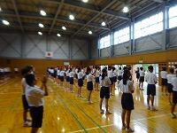 9月10日(木)5時間目の体育館での3年生女子体育の授業の様子です。暑い中でのダンスは大変かと思ってのぞいたところ、昨日、届いた大型ファン「ビックファン」が使われていました。一台で体育館の中央部まで風が届いており、生徒は喜んでいました。7月・8月は工業型扇風機を入れたのですが、こちらの方が安全で風力も強く好評です。今日は一台だけ使用していましたが、二台入りましたので部活動を含め有効に活用してほしいと思います。