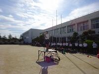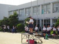 10月20日(火)5・6時間目に全校生徒が椅子を持ってグラウンドに集合し、スケアードストレート自転車交通安全教室が開催されました。柏警察交通安全課の方からの交通安全講話の後、スーパードライバーズの皆さんによる実際の事故現場の再現にもとづく自転車交通安全教室が行われました。日頃、自転車通学者に繰り返し注意している内容が再現されていましたので事故になる危険性を改めて学ぶことができたと思います。開会式は市の交通施設課の方が進行等を行いましたが、閉会式は新生徒会役員が進行やお礼の言葉等を行いました。