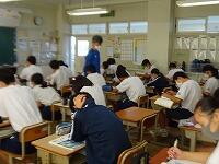 10月21日(水)今日は数学の授業の紹介です。まず最初の3枚の写真は単元テストや小テストの様子です。今学期も期末テストだけですので単元ごとや毎授業でのテストを数学科は各学年とも行っています。次の3枚の写真は1年生の数学4時間のうち3時間がティームティーチングで職員2名で指導にあたっている様子です。次の2枚の写真は2年生の数学の授業です。教え合い等、席を移動して解答の確認をする授業が頻繁に行われています。最後の授業は10月から3年生の放課後の補習と授業での支援のために学習サポーターを県よりつけていただいています。大学生の古賀さんに週3回来ていただいています。