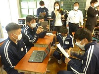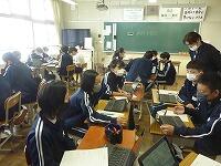 10月15日(金)1校時に「一人一台タブレット活用」について柏市の委員となっている河野教諭が英語の授業を3年生で行いました。「記者会見をしよう」の4時間目です。仮想の記者会見をタブレット上で設定してグループや個人で発表するための準備をしていました。次の時間が本番の発表となりますが、今日も工夫された発表が沢山あって楽しい内容でした。本日は教育委員会指導課より4名の指導主事が来校して参観や記録を行っていました。この授業の内容を柏市の「一人一台タブレット活用」委員会で検討する予定になっています。