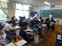 夏休みの宿題が変わります。24日(木)1年生の社会の授業の様子です。タブレットでオンラインドリル(ミライシードドリルパーク)を活用して地理の練習問題を解いていました。今までの夏休みの宿題はプリントや冊子が配付されていましたが、タブレットの持ち帰りでオンラインドリルを今後の宿題の中心にしていくため各教科で現在、準備しているところです。