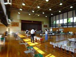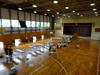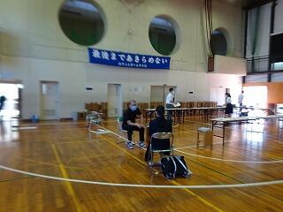 まずプール側の入り口前の受付を通ったら手を洗って体育館に入場します。体育館には各クラスの待機場所と課題の受け取り場所、担任との面談場所を三密を避ける形で設定しました。予定の時間より早目に登校した生徒もいますが、ほぼ予定通りに面談形式で進行しています。