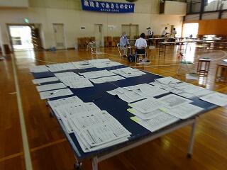 5月12日(火)2年生プリント配布日二日目の様子です。今日も体育館の中を三密にならないように設定して課題の配布と面談を行っています。持ち帰る物には課題以外にお知らせ等のプリントも多く、目を通していただくのは大変かと思いますが、ご家庭でお子様と一緒に一読していただきますようお願い申し上げます。次回の登校についてはまた「すくすくメール」やホームページでお知らせいたします。明日からは3年生のプリント配布日となります。