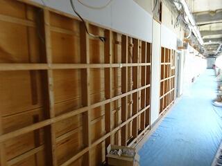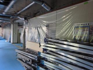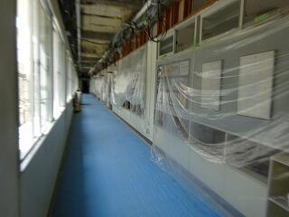 5月15日(金)管理棟の工事の様子です。図書室の壁ができあがりつつあります。天井の新たなダクトも見えてきました。職員室の廊下の壁には穴があけられていて、天井はまだむき出しの状態です。放送室の廊下の壁もはがされています。会議室や校長室の壁も同じように抜かれているところがあります。明日も工事は続きます。学校再開までにどこまで進むかです。