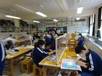 6月16日(火)2校時の3年生の美術の授業です。美術室で篆刻の授業が行われていました。昨日の一斉登校により3つの密の中で密接にならないようにするのが一番難しい状況です。教室では対面やグループ活動は短時間で行うか、できるだけ行わない授業が展開されていますが、技能教科では長時間、対面で作業をしなければならない場面もあります。そこで美術室には写真のように美術科の大沼教諭の自作による対面飛散防止が各作業机に施されています。被服室にも設置する予定です。