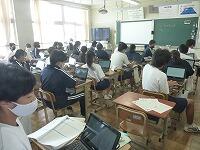 7月14日(水)天気が不安定な様子ですが、本日も平常授業が行われています。学期末で残り授業も少なくなり、夏休みの宿題についての説明や実際に宿題に取り組む授業も見られます。2年理科では図書室で自由研究のテーマ探しを行っていました。2年英語ではタブレットでALTのシルバ先生が作成した学習シートが紹介されていました。1年国語では課題作文について説明があり、下書きを始めている生徒もいました。2年社会でも夏休みの課題レポートの説明が配付され、紙又はタブレットでレポートを作成してよいことが連絡されたいました。