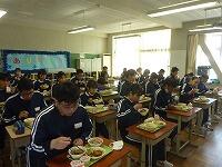 2月9日(水)3年生にとって最後の給食の時間となりました。今日のメニューは祝い膳で赤飯、からあげ、春雨サラダ、五目汁、お祝いイチゴゼリーでした。2年間の黙食の給食が終わりました。本当は班で会食し、楽しい時間にしてほしかったのですが、よく我慢して黙食を続けてくれたと思います。そのおかげでクラスターの発生もなく卒業式を迎えられることに感謝します。給食中の放送では3年生の職員が放送委員会にリクエストした3年生に贈る曲が流されていました。明日の3年生は卒業式前最後の登校で午前で下校、午後に卒業式準備を行います。