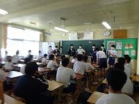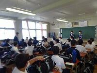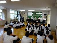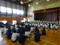 6月26日(金)昼休みに体育館で短時間の集会を行いました。集まってもらったのは自転車通学者です。今週、ご近所より自転車の乗り方についてご指摘いただいたことを安全主任より指導しました。下校の際は沼南庁舎の前を通りますが、一時停止の標識があっても止まって左右の確認ができていないこと、更に前進して船取線を曲がる際も止まらずに一気に曲がるので走行する車のドライバーが飛び出しではないかと驚く場面があることを説明し、今後は必ずこの2か所では止まることを指導しました。行きだけでなく帰りも安全運転でお願いします。