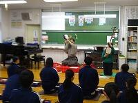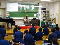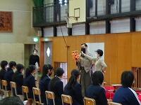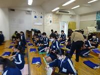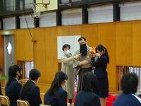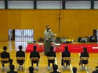 1月28日(木)みぞれ雨の降る午後、体育館に3年生全クラスが入り、席を広くとって長唄・三味線鑑賞会を行いました。コロナ禍の中、昨日よりご指導いただいている杵家弥佑様と杵家会の皆様に伝統のある長唄・三味線について学習し、鑑賞させていただく機会をご提供いただたいたことに感謝申し上げます。鼓や拍子等について説明だけでなく、生徒にも体験をさせていただいたり、質問にも丁寧にお答えいただきました。本日は「勧進帳」の一節を聴かせていただいたのですが、最後に校歌も演奏していただき生徒達は大変喜んでいました。3年生にとって本当に貴重な時間になったと思います。