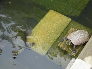 さて、今日は中庭で暮らす亀についての紹介です。中庭には二つの調整池があり、その一つに大が2匹、中が1匹、小が1匹の計4匹の亀が仲良く暮らしています。人懐こく池をのぞくと必ず4匹が水面に出てきます。もう一つの池には金魚等がいます。