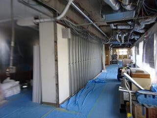 5月15日(金)管理棟の工事の様子です。図書室の壁ができあがりつつあります。天井の新たなダクトも見えてきました。職員室の廊下の壁には穴があけられていて、天井はまだむき出しの状態です。放送室の廊下の壁もはがされています。会議室や校長室の壁も同じように抜かれているところがあります。明日も工事は続きます。学校再開までにどこまで進むかです。