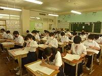 6月22日(火)前期中間テスト初日の1年生の様子です。本校ではテストは原則、制服で受けます。中央委員の指示で黙想がかかり、先頭の生徒が監督者から問題・解答用紙を受け取り、各列に配付します。準備が終わって「始め」の合図まで問題を見たりすることはできません。1年生は開始直後に聞き取りの問題に取り組んでいました。