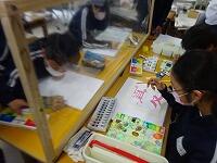 さて、1・2年生の美術の様子です。上の2枚は2年生が篆刻をしているところです。3年生になると印箱の製作になると思います。下の2枚は1年生が絵文字「自分ならこう読む」を描いていました。レタリングを終えて絵文字に取り組んでいます。