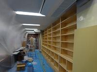 6月6日(土)今日も工事が続いていますが、とても静かです。空調の風力測定を行っているからです。写真は職員室前の廊下と図書室の状況です。天井にダクト等空調設備が新たに付きましたが、まだ動きません。現在、稼働できるのは生徒の教室棟だけです。図書室については壁ができ、内側の本棚も取り付けられました。塗装をこれから行いますので図書室のオープンには本の整備も考えるとあと2週間は必要かと思います。