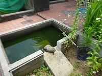 中庭のアジサイがきれいに咲く季節となりました。朝方は曇っていたので涼しく感じましたが、日がでてくると暑くなってきました。池の亀も甲羅干ししていましたが、やはり暑いからでしょうか。池の中へ入っていきました。