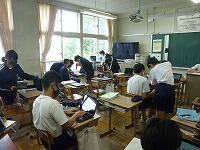 7月13日(火)蒸し暑い日ですが、生徒は1校時より授業にしっかり取り組んでいました。2年生の英語の授業では「mustとhave to」についてタブレットを活用して授業が進められていました。2年生の理科では夏休みの自由研究についてのタブレットで調べものをしていました。レポートも紙だけでなくタブレットで作成することも可とされていました。夏休みの課題もペーパレス化が始まっています。
