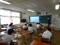 今日は2年生の男子の分散登校の最後の日です。理科、数学、社会、英語の授業が行われていました。現在は対面やグループ活動がしづらい状況ですので一斉授業の形式がどうしても多くなりますが、各教科でICTを活用して楽しく学べるよう工夫しています。ご覧の写真のようにどのクラスもプロジェクターとスクリーンを使って授業を行っていますが、昨年度の9月に市内では一番早くICT機器のリプレイスが行われ、明るい教室でも鮮明に写せるプロジェクターにかわりました。スクリーンもしわのよらない、こわれにくい物になりました。PCもとりはずして使えるタブレット型になりましたので授業におけるICTの活用は当たり前になっています。