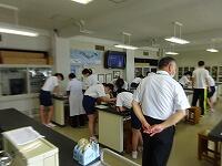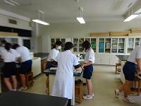 6月12日(金)教育委員会指導課の河村アドバイザーが理科教育支援員の勤務状況について学校訪問されました。今日は2年生の女子の分散登校最終日です。第一理科室で実験を行っていました。柏市は他市の理科の先生がうらやましがる理科教育支援員を各校に配置しています。理科教育支援員は、実験の準備や片付け、授業中の支援、理科準備室の整備や薬品庫の管理等の仕事をされています。現在、理科室の入り口には消毒液が置かれていて入室の時には必ず消毒を行います。他の特別教室前にも配置してあります。