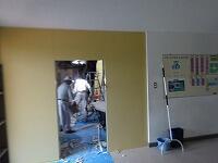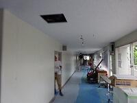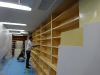 6月13日(土)雨が激しく降っていますが、校内では工事が継続されています。写真にありますように15日(月)より事務室・保健室の工事のため職員玄関を入って事務室の角を曲がるところから封鎖いたしますので逆に進んでいただき、生徒と同じ階段を利用して2階へ上がっていただくことになります。7月の半ばまでご迷惑をおかけしますが、よろしくお願いいたします。2階の図書室前の天井や壁の工事が終わり、本棚の塗装等が行われていました。15日(月)から通路として使えるようになります。