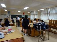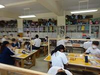6月16日(火)2校時の3年生の美術の授業です。美術室で篆刻の授業が行われていました。昨日の一斉登校により3つの密の中で密接にならないようにするのが一番難しい状況です。教室では対面やグループ活動は短時間で行うか、できるだけ行わない授業が展開されていますが、技能教科では長時間、対面で作業をしなければならない場面もあります。そこで美術室には写真のように美術科の大沼教諭の自作による対面飛散防止が各作業机に施されています。被服室にも設置する予定です。