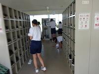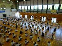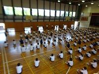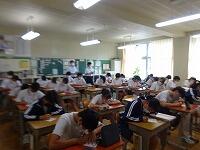 8月5日(水)1・2年生は一学期のまとめと夏休み指導の集会を開きました。1年生は体育館でめいっぱい広がって工業用扇風機を回して行いました。クラスの代表や委員会の代表の一学期のまとめや反省の発表の後に、学年の先生から学習や生活について夏休みの指導も兼ねて話がありました。2年生は同じ内容を教室で行いました。委員会の代表が順番に各クラスを回ります。学年の先生も担当者ごとに回ってくるという形で行っていました。授業と給食は明日が最終日です。大掃除も行います。