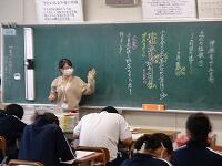 今月の校内研修に向けて、今回は国語の授業の紹介です。一段目の写真は3年生の国語の授業です。授業の開始時には漢字の読み書きや熟語の学習をしています。現在は現代文の読解に取り組んでいます。二段目は2年生の国語の授業です。現在は近代短歌について学習しています。よく発表していました。三段目は1年生の国語の授業です。授業の開始時に辞書の早引きを行っています。素早く引いて手を挙げる人が多く、辞書の扱いに慣れてきているようです。現在は「竹取物語」や「オツベルと象」を題材に授業が行われています。どの学年も言語能力の向上を図る取り組みが日々行われています。その力が他の教科にも大きく関わると思います。