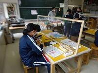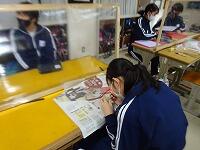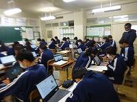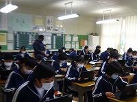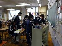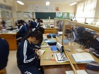 さて、今回は調べ学習を紹介します。調べ学習はどの教科でも行っており、かつては図書室やコンピュータ室を利用して行っていましたが、今は教室で同じことができます。上の2枚の写真は昨日の3年生の国語の様子です。万葉集についてブックトラックから本を選んで調べ学習をしていました。学校図書館指導員に調べるテーマの内容で依頼しますとブックトラックに必要な本を沢山そろえてもらえますので図書室で探す手間がありません。下の2枚は今日の3年生の英語の授業の様子です。教室でタブレットを使って日本文化について調べていました。「何について調べているのか」ALTのガヤ先生から質問され、英語で応答していました。今後、全生徒が常時タブレットを使用できるようになりますので本日はそのための職員研修があり、部活動はありません。一斉下校となります。