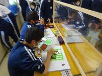 さて、1・2年生の美術の様子です。上の2枚は2年生が篆刻をしているところです。3年生になると印箱の製作になると思います。下の2枚は1年生が絵文字「自分ならこう読む」を描いていました。レタリングを終えて絵文字に取り組んでいます。