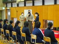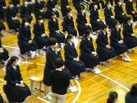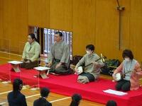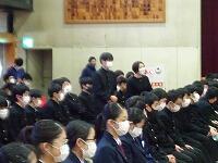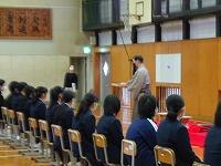 1月28日(木)みぞれ雨の降る午後、体育館に3年生全クラスが入り、席を広くとって長唄・三味線鑑賞会を行いました。コロナ禍の中、昨日よりご指導いただいている杵家弥佑様と杵家会の皆様に伝統のある長唄・三味線について学習し、鑑賞させていただく機会をご提供いただたいたことに感謝申し上げます。鼓や拍子等について説明だけでなく、生徒にも体験をさせていただいたり、質問にも丁寧にお答えいただきました。本日は「勧進帳」の一節を聴かせていただいたのですが、最後に校歌も演奏していただき生徒達は大変喜んでいました。3年生にとって本当に貴重な時間になったと思います。