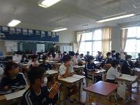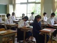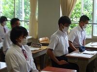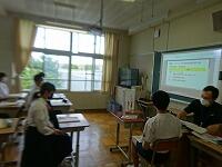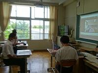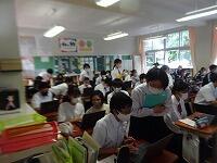 6月3日(木)通信状況が朝から良くなかったため心配はありましたが、3階多目的室を総会本部として17クラスとGoogleMeet でつなげる生徒総会が無事に終了しました。議長には3年生の新堀さん、2年生の佐藤さんが指名され、進行を務めました。まず生徒会活動目標・方針・計画の説明を生徒会本部が行いました。それに対してクラスで承認がとられ、画面に示されるという形式を次の各委員長からの委員会・活動目標・計画の承認、部会長からの各部の目標・計画の承認のすべての議案で行いました。質問者も画面に登場し、委員長が応答しました。最後に生徒会長から今後の学校生活についての提案があり、全校で学校への提案が承認されました。今後職員で検討し、代表委員会へ回答することを校長より話しました。初の試みでしたが、無事に終わったことで生徒総会本部に詰めていた全員から安堵と成功への大きな拍手が起きて終了しました。