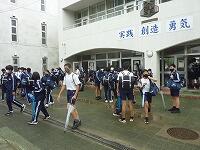 7月1日(木)本格的な雨の日となりました。自転車通学者は以前より雨天時に体操服やジャージで登校していましたが、6月の生徒総会を経て徒歩通学者も全員、雨天時の体操服やジャージ登下校が可となりました。下校時の雨は弱くなる予報ですが、体操服・ジャージで下校する生徒が多いと思います。朝の部活動で外で練習できない部は校内で補強運動をしていました。午後も外での活動は難しそうです。