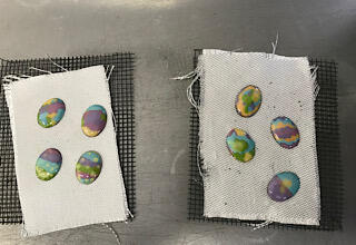 こねた釉薬を、薄いドーム型の楕円の土台の上に、のせていきます。5色の釉薬で模様を考えながら作ります。