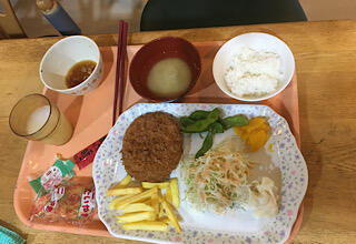お昼ごはんの時間です。コロッケ、ミートボール、サラダ、ハヤシライス、ごはん、みそ汁、そしてドリンクバー。おなかすいた。おいしそう!