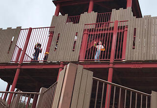 じゅえむタワーは綱を渡ったり坂のはしごを登ったり。ワンパク城と長いすべり台でつながっています。