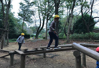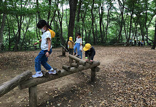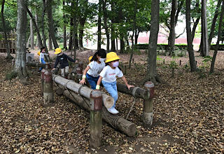 アスレチックも楽しいです。シーソーが大人気。ブランコや丸太渡りなど、みんなで仲良く遊びます。