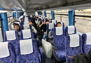 バスの中では、レク係が考えたレクで楽しんでいます。なぞなぞや誰でしょうクイズ、時間当てクイズ、名前並べ替えクイズなど、盛りだくさんで、とても盛り上がっています。