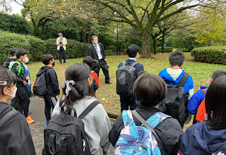 公園内の吉田茂総理大臣の銅像を見学しました。外務大臣として、戦争終結に力を注ぎ、戦後の総理大臣として大きな功績のあった人です、と社会科の遠藤先生から解説がありました。