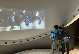 次に、ブルーバックスクリーンを使った空飛ぶじゅうたん体験です。
