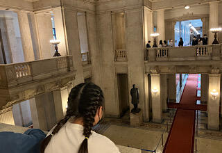 中央広間を上から見学しました。窓や天井には、ステンドグラスがはめこまれていて、とても重厚な感じがしました。