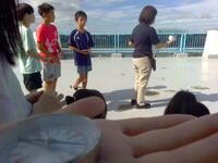 6年生は理科で朝学習に昼の月を屋上から観察しました。