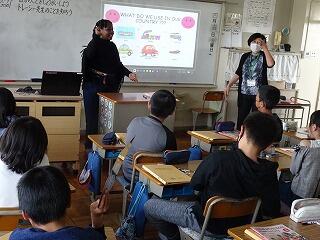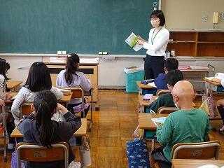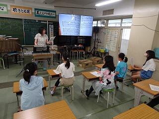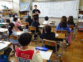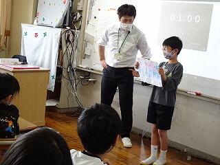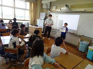 そこで、まず、主役である子供たちと地域のつながりをつくりたいと考え、地域で様々な活動をされている方々をお呼びして、「どんな目的で活動をされているのか」「その活動における地域の課題は何か」「私たち(大津一小の子供)にできることはないか」について、インタビュー形式でお話をしていただきました。
