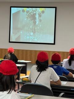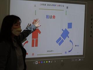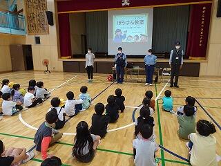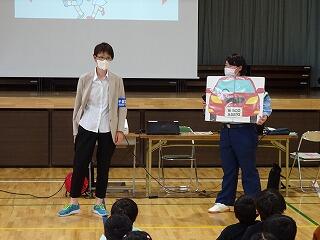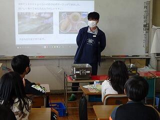 栄養教諭から給食センターで給食を作る様子を紹介したり、食の大切さについてお話をしました。