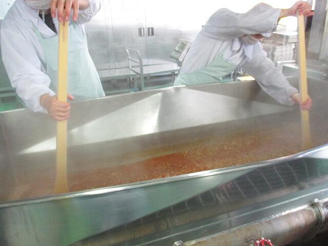 大きな釜は、大人二人がかりで一生懸命混ぜています。