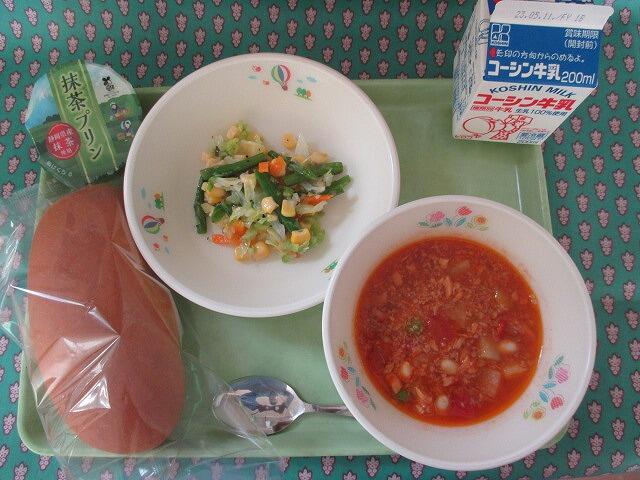 サラダにはバジルとオリーブオイルを使って,イタリア風に仕上げました。ミネストローネにはトマトと大豆がたくさん入っています。今日は大豆はペースト状になっているので,スープの旨味に溶け込んでいます。栄養たっぷりのスープで暑さに負けない体を作ってくださいね。