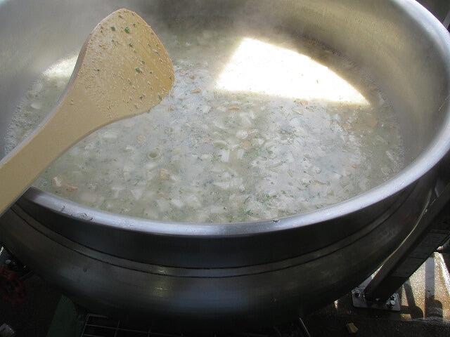 今日は全部で8150本のししゃもを揚げました。おみそ汁には、新玉ねぎがたっぷり入っています。