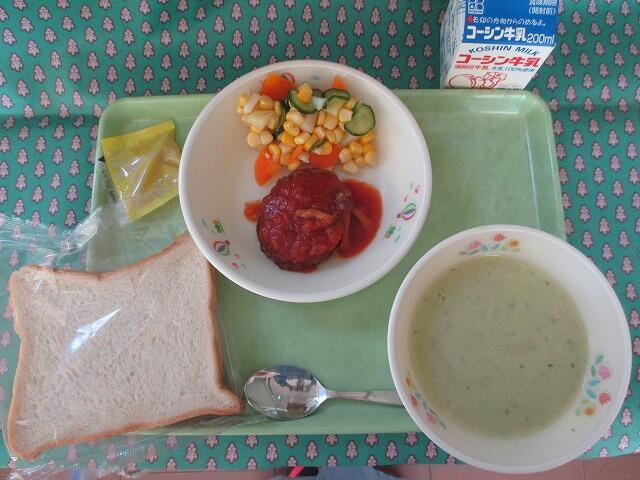 5月10日 牛乳 食パン ハンバーグのトマトソースがけ マセドアンポテト グリーンポタージュ あんずジャム