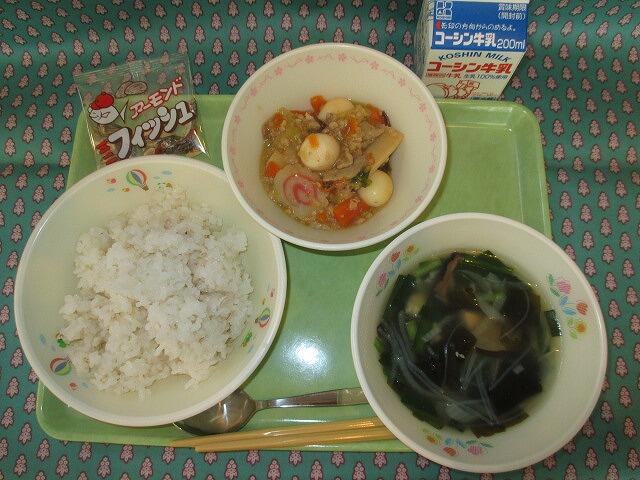 4月18日 牛乳 ご飯 いかのかりん揚げ たけのこのおかか煮 豚汁
