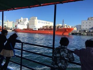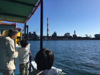 船から岸を見ます。大きなコンテナや工場がたくさん並んでいます。