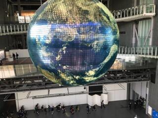 大きな球体は、地球に見立てています。映像で地球の歴史や雲の様子などが映し出されています。